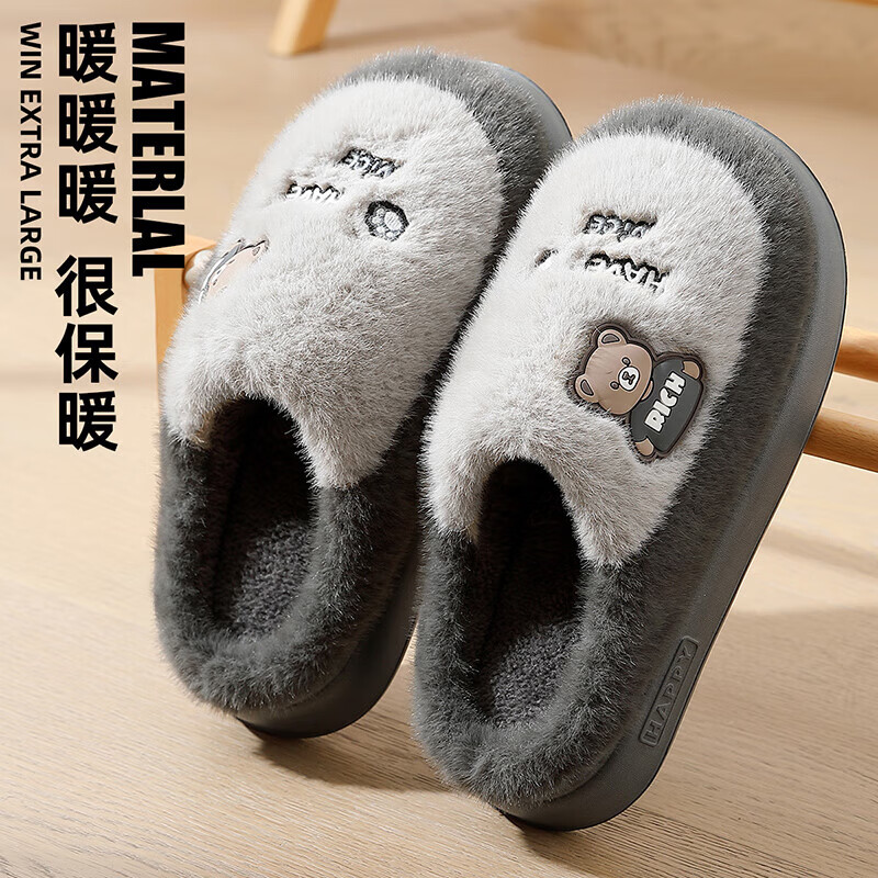 安尚芬男士棉拖鞋男款秋冬季2024新款室内家居厚底防滑毛毛绒保暖拖鞋女 深灰色【可爱小熊】 40-41