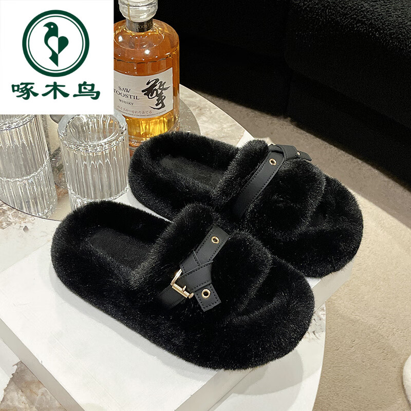 啄木鸟舒适毛毛拖鞋女外穿2025年新款秋冬小众设计感时尚居家平底棉拖鞋 黑色 35