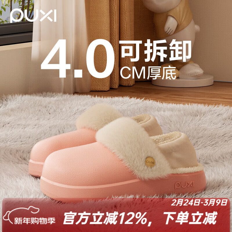 朴西厚底防水棉拖鞋女士冬季外穿加绒加厚保暖家居包跟踩脚情侣棉鞋女 浅粉色 36-37