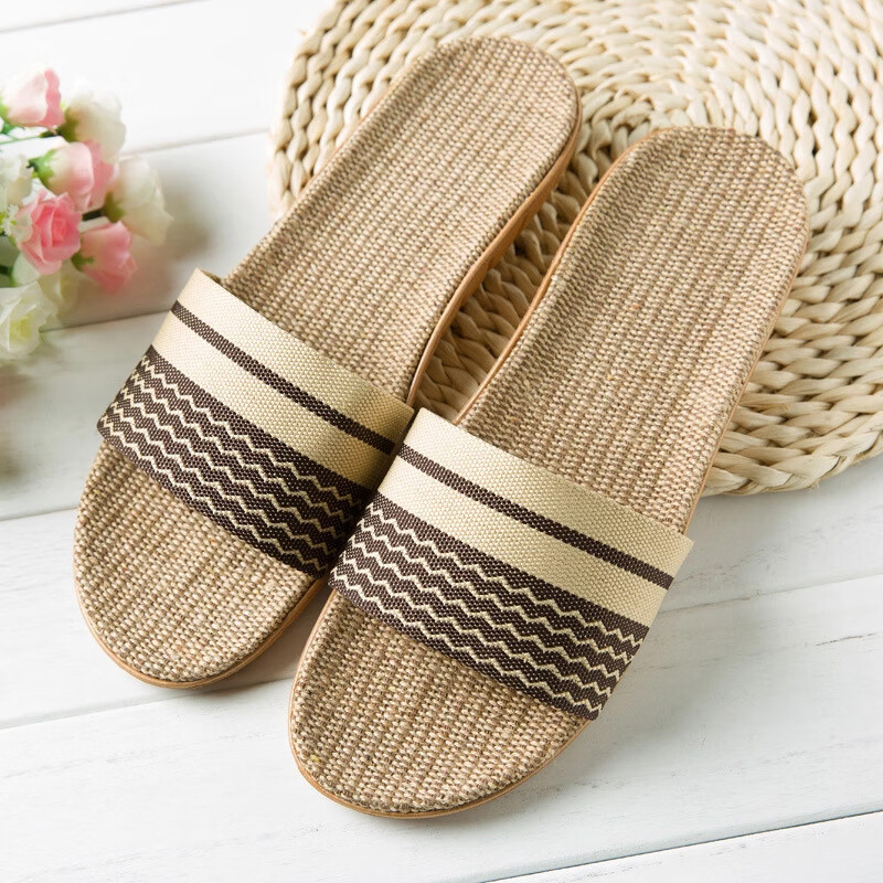 韵优利(yunyouli)亚麻拖鞋家居情侣室内拖鞋木地板棉麻居家厚底夏季凉拖鞋男女 一字波浪咖啡 44-45