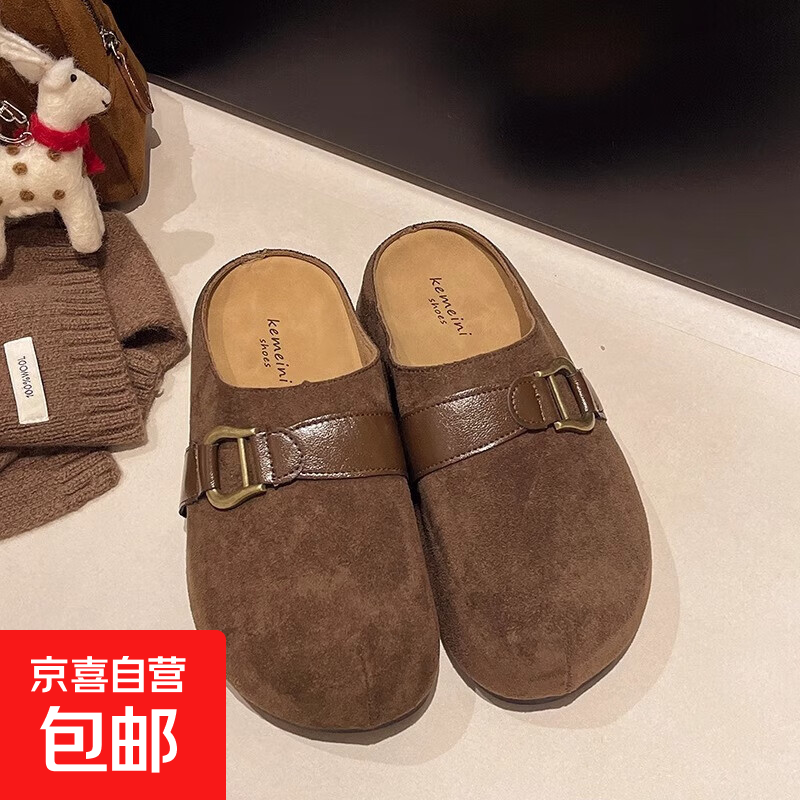 内增高勃肯拖鞋女外穿2025春新款绒时尚金属扣一脚蹬包头拖鞋厚底 深棕色 36