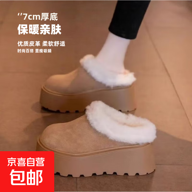 厚底增高雪地靴包头半拖鞋女外穿2026新款冬季勃肯鞋加绒毛毛棉拖 卡其色 35