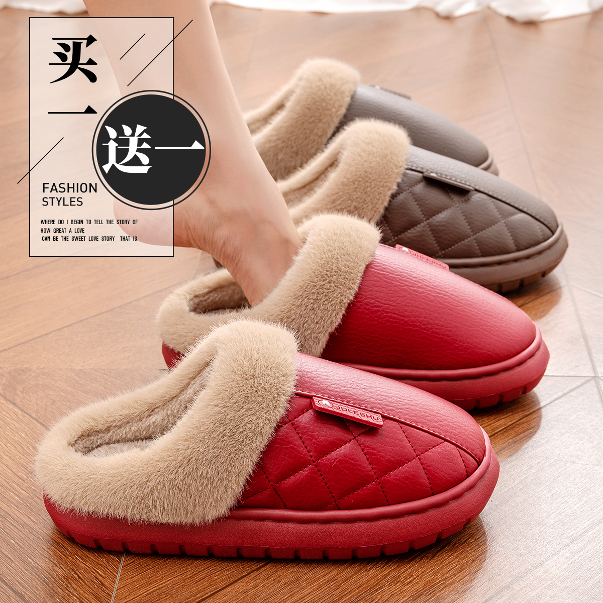 买一送一防水棉拖鞋女秋冬季2025新款情侣居家一对防滑保暖皮拖鞋