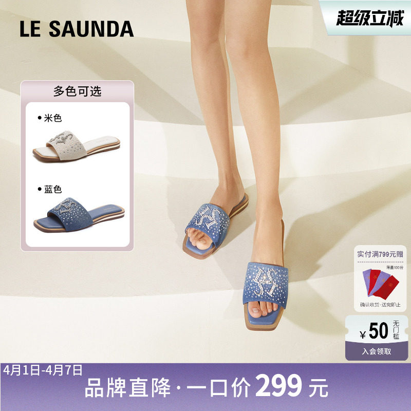 莱尔斯丹春夏新款商场同款时尚水钻方头低跟拖鞋女鞋4M01402