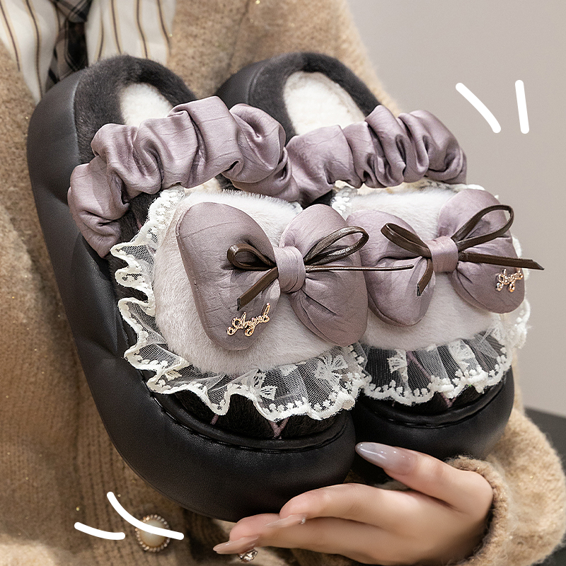 新款蝴蝶结棉拖鞋女款可爱家用厚底加绒保暖月子鞋防寒毛绒毛拖鞋
