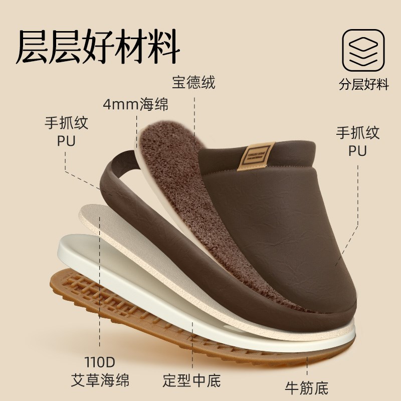 欧式男士牛筋底防水棉拖鞋冬季室内加绒保暖家居防滑PU皮拖秋冬天