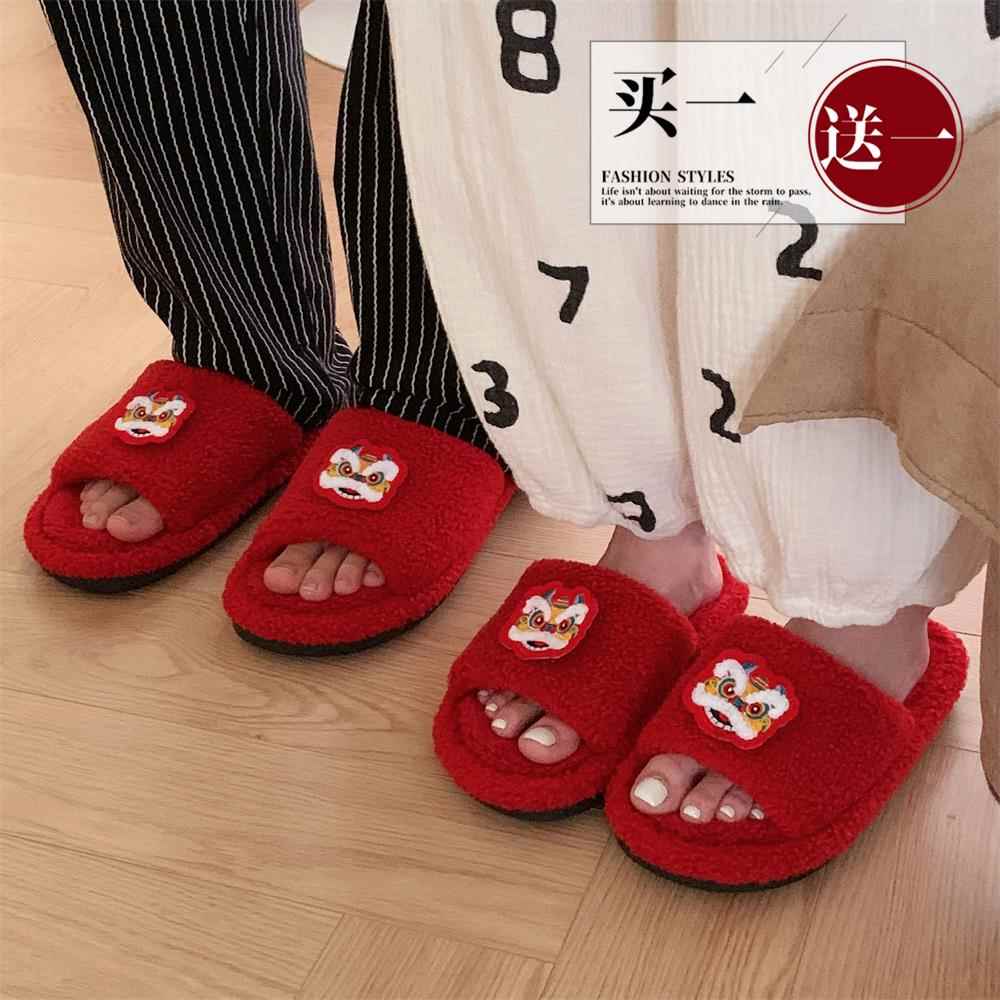 买一送一可爱醒狮棉拖鞋男女冬居家新年红色情侣毛毛拖鞋
