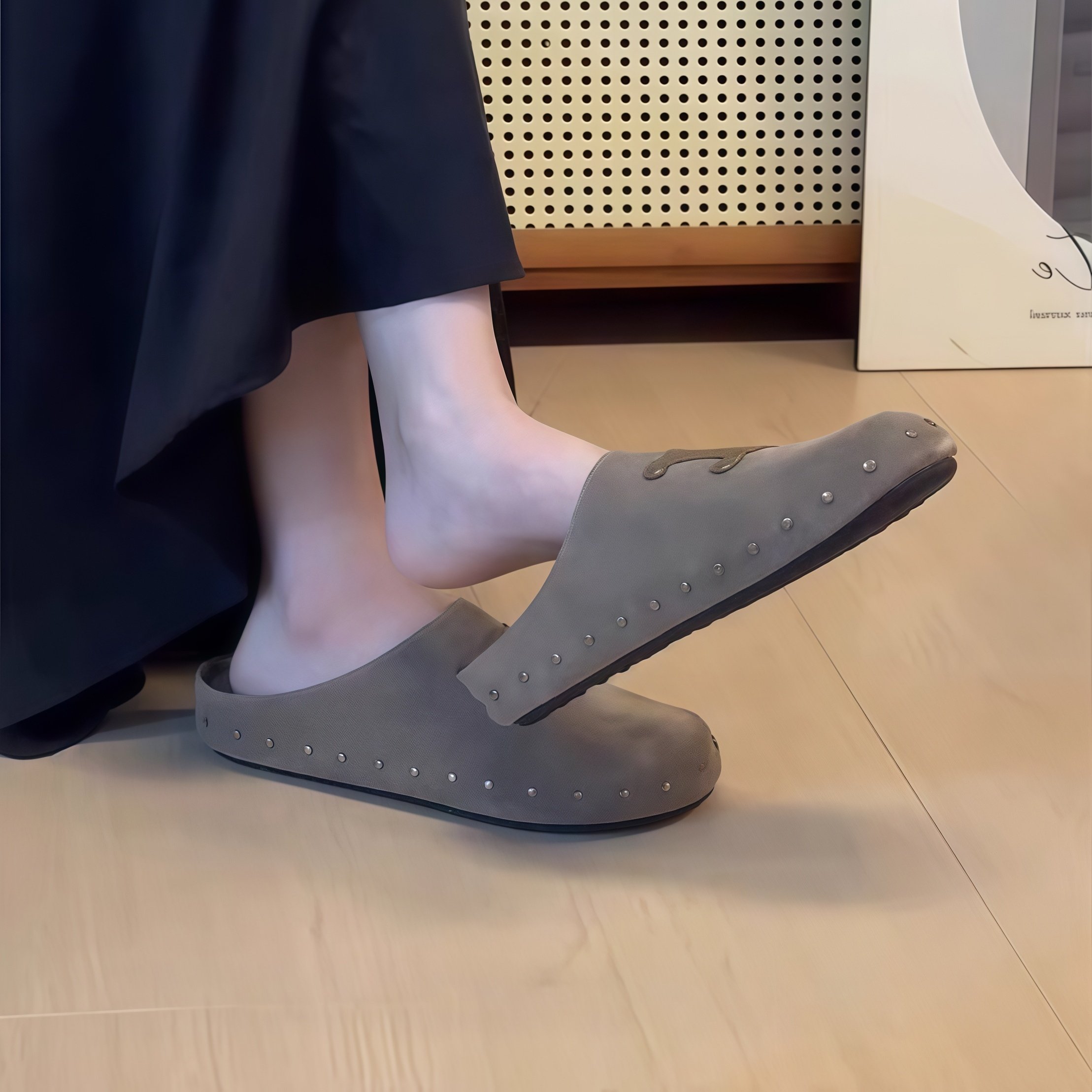 真皮复古包头半拖鞋女2025新款圆头厚底勃肯鞋懒人一脚蹬软底单鞋