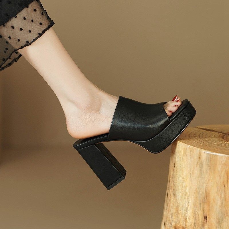 2025夏季新款女鞋头层牛皮露趾一字型粗跟外穿凉拖鞋女高跟凉鞋