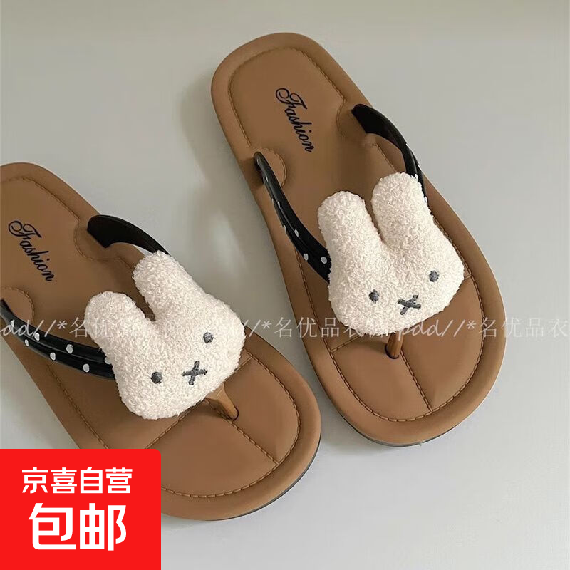 新款ins风可爱米菲兔软底人字拖爆款甜美少女心卡通平底拖鞋夏季 黑色 36-37 适合35-36脚
