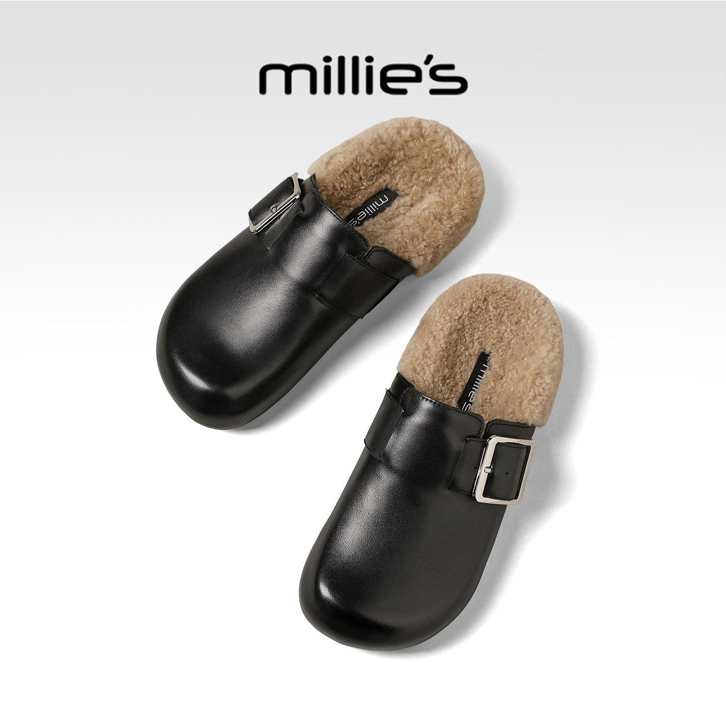 millies妙丽厚底包头勃肯半拖鞋女毛毛鞋外穿一脚蹬棉拖软底真皮