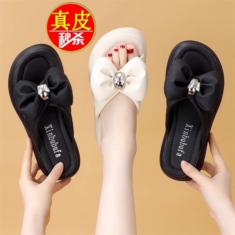 品牌真皮蝴蝶结踩屎感凉拖鞋女夏外穿2025新款时尚百搭沙滩一字拖
