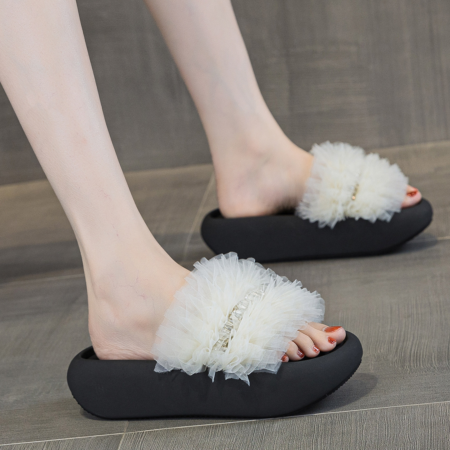 时尚气质带钻厚底凉拖鞋女款踩屎感2026夏新款蕾丝边休闲拖鞋软底