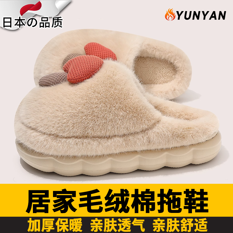 日本无印秋季情侣家用高级感简约薄绒棉拖鞋女室内防滑牛筋底家用