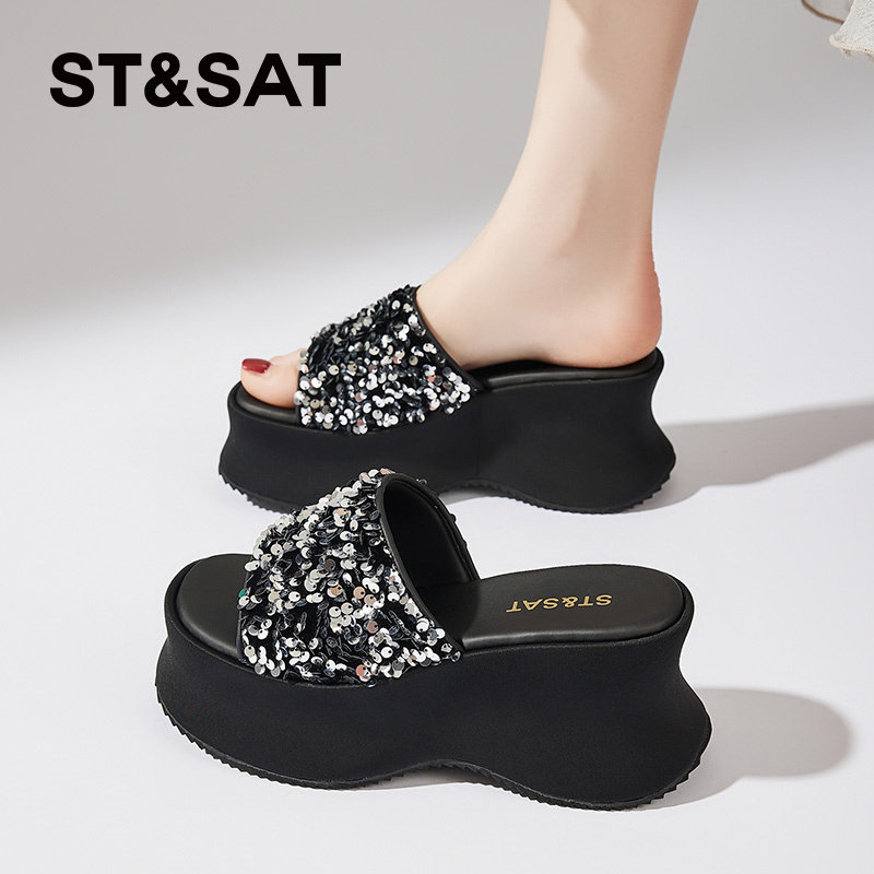星期六拖鞋女外穿夏季露趾一字拖小个子厚底增高凉拖鞋亮片高级感