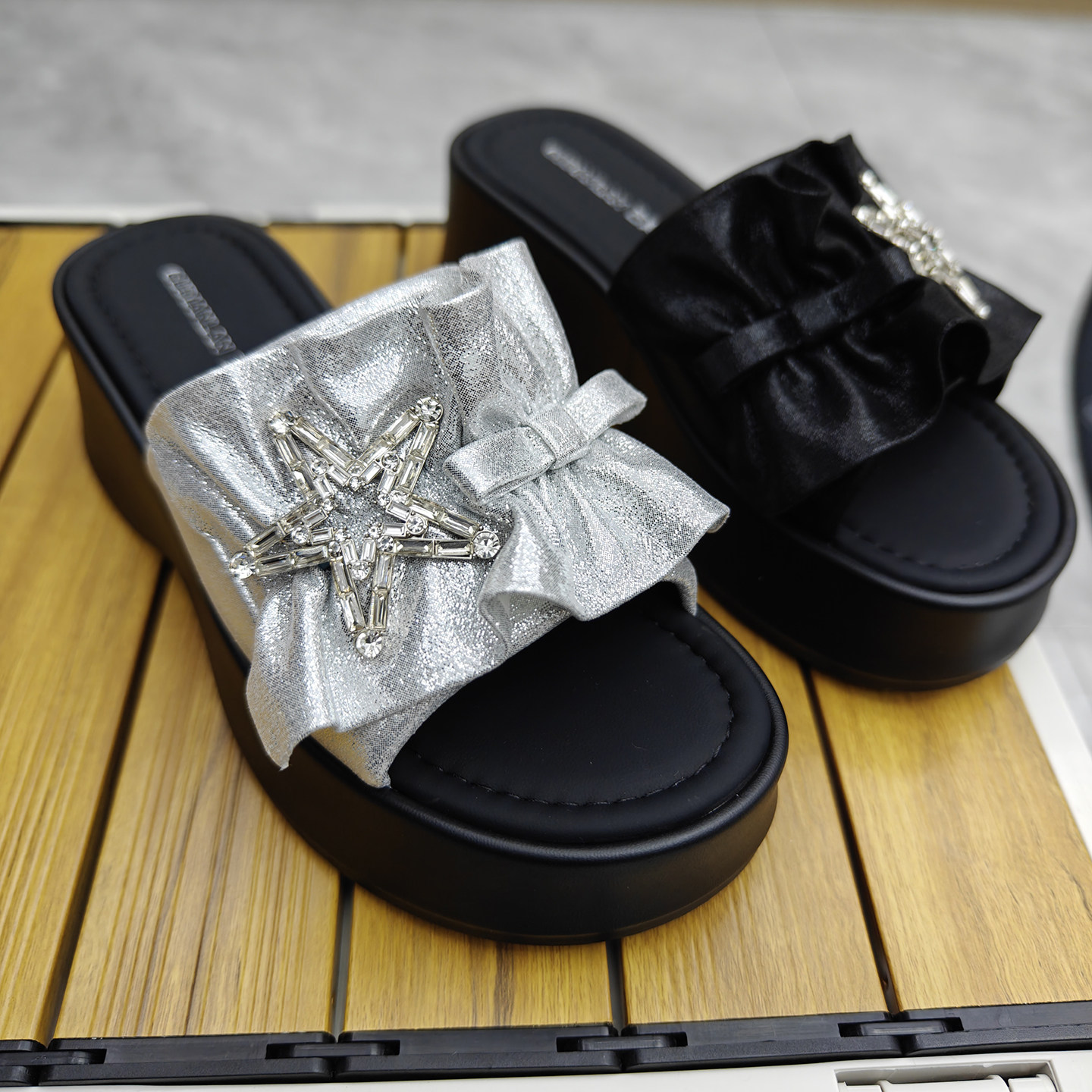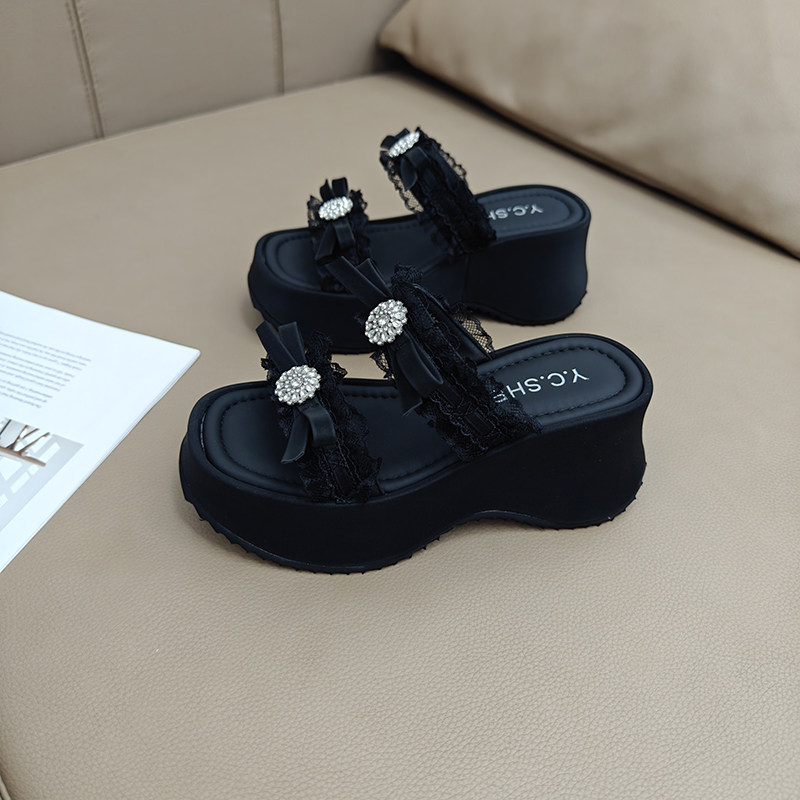 水钻蝴蝶结蕾丝厚底松糕底凉鞋女露趾显高拖鞋2025夏季百搭一字拖