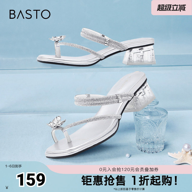 百思图春夏季新款商场同款时尚简约潮流粗跟女拖鞋BP569BT4