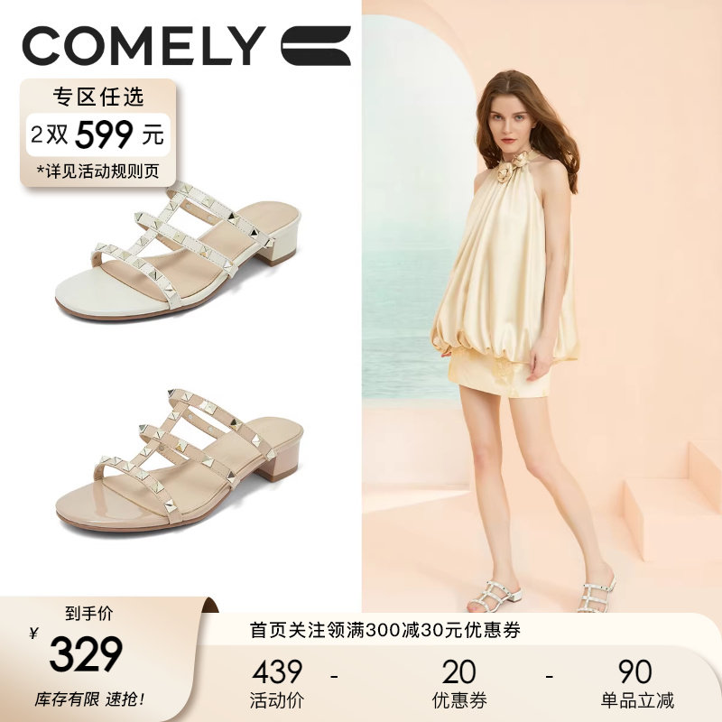 康莉2025年新款拖鞋女夏外穿时尚高级铆钉粗跟真皮一字拖高跟鞋