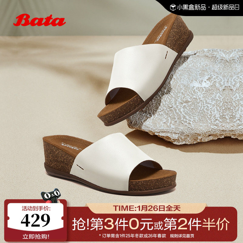 Bata海岸遐想商场新款羊皮厚软底一字凉外穿拖鞋AYX02BT5