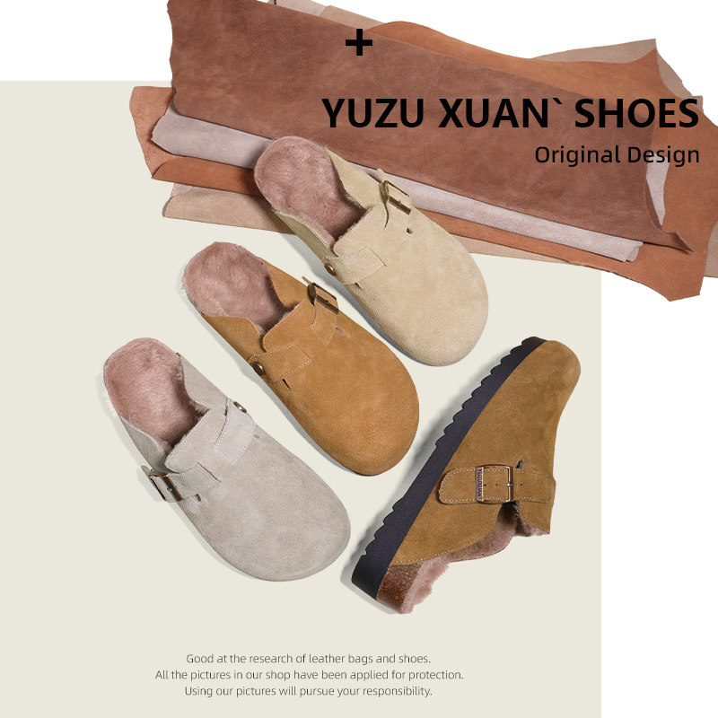 牛皮包头勃肯鞋毛毛拖鞋秋冬季厚底一脚蹬加绒包头半拖棉拖博肯鞋
