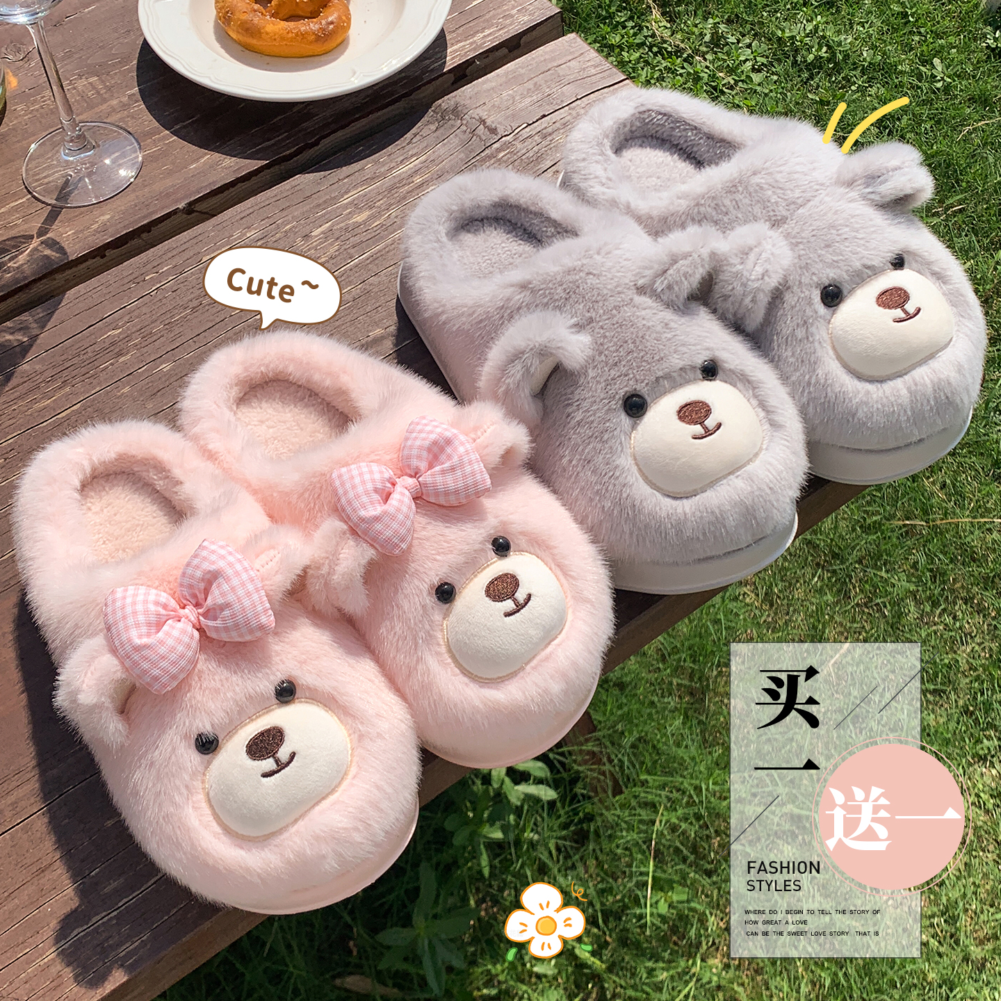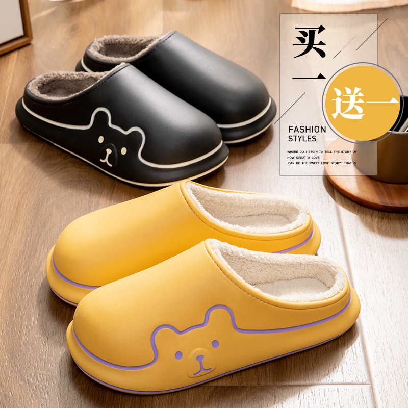 买一送一可爱小熊棉拖鞋女款冬季2025新款室内居家毛毛绒拖鞋男秋