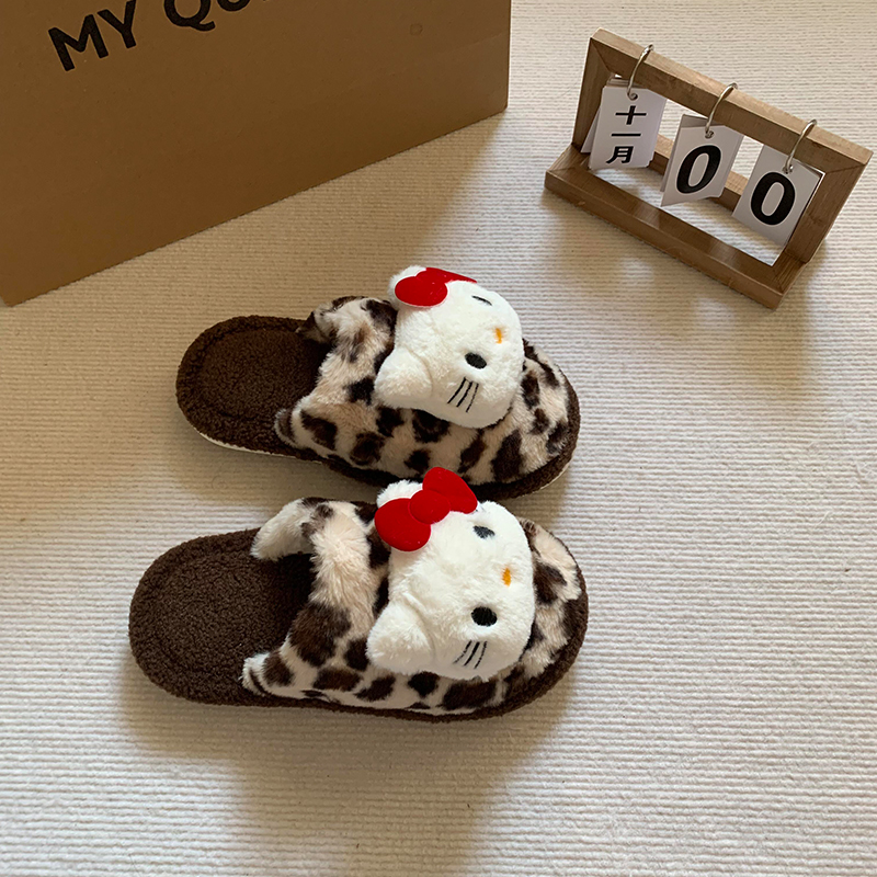哈喽kitty拖鞋豹纹毛绒室内加绒加厚冬季防滑保暖软底棉拖鞋可爱