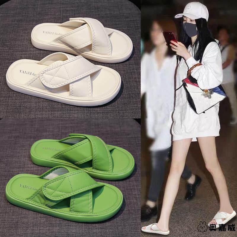 网红交叉休闲拖鞋女秋2025新款平底轻便懒人凉拖鞋ins潮爆款百搭