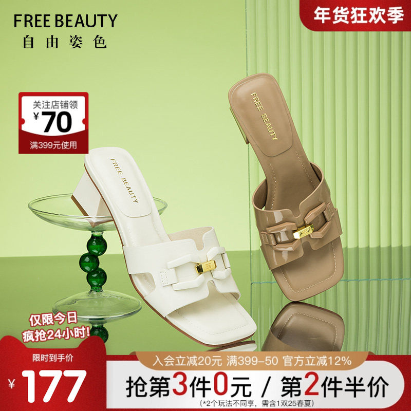 自由姿色夏季新款经典马衔扣方头粗跟露趾清爽凉拖女时装拖鞋女