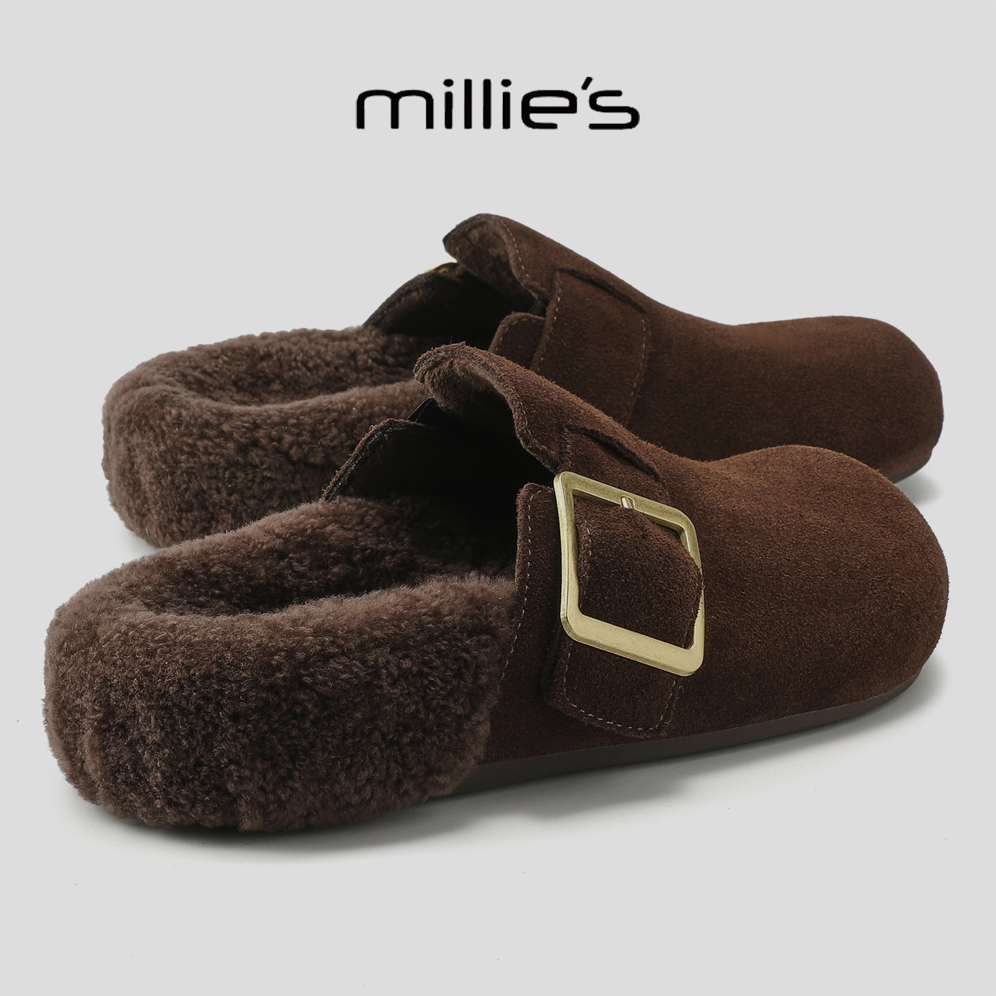 MILLIE'S/妙丽2025冬季新款加绒包头毛毛鞋懒人鞋不累脚勃肯拖鞋