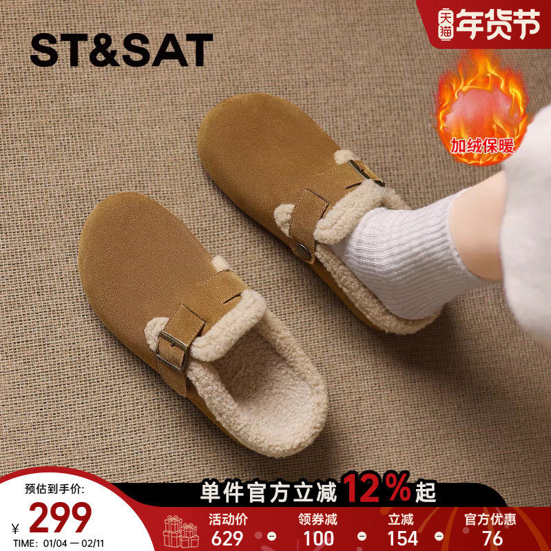 星期六复古真皮加绒勃肯鞋懒人半拖鞋女鞋2025冬季新款保暖毛毛鞋