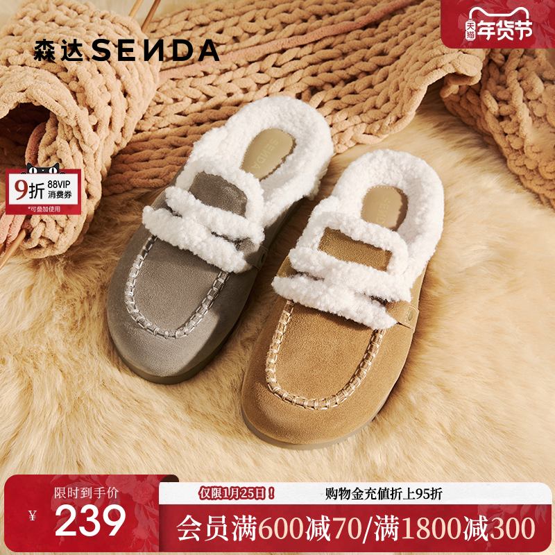 森达小太阳牛皮厚底毛毛鞋女25冬季新款商场外穿毛绒拖鞋XSR01DT5