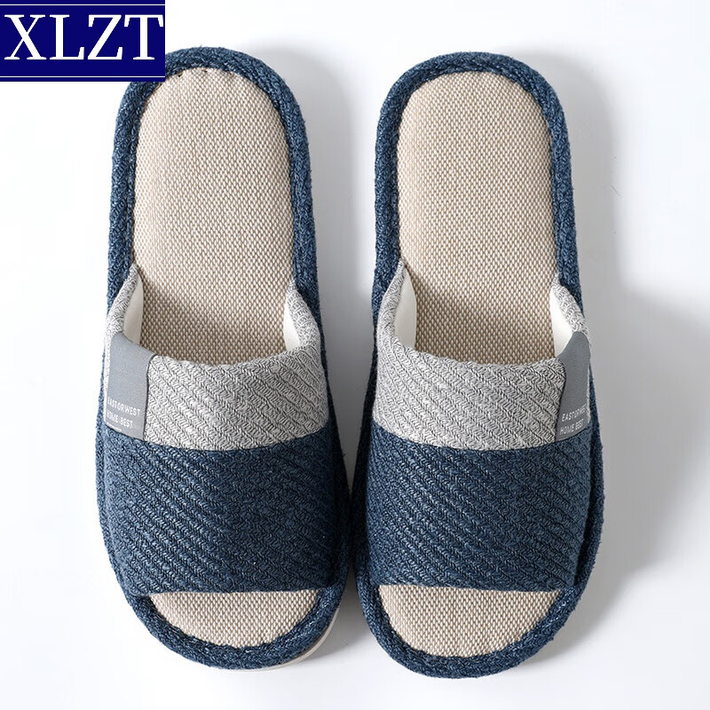 XLZT亚麻拖鞋拼接棉麻室内地板防滑耐磨家居春秋四季软底情侣男士 深蓝 44-45(适合43-44脚)