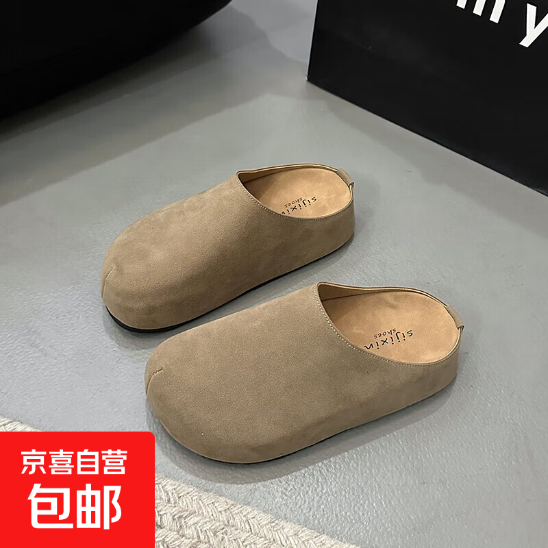 厚底勃肯鞋女外穿2025年春季新款懒人增高复古丑萌大头包头半拖鞋 卡其色 37
