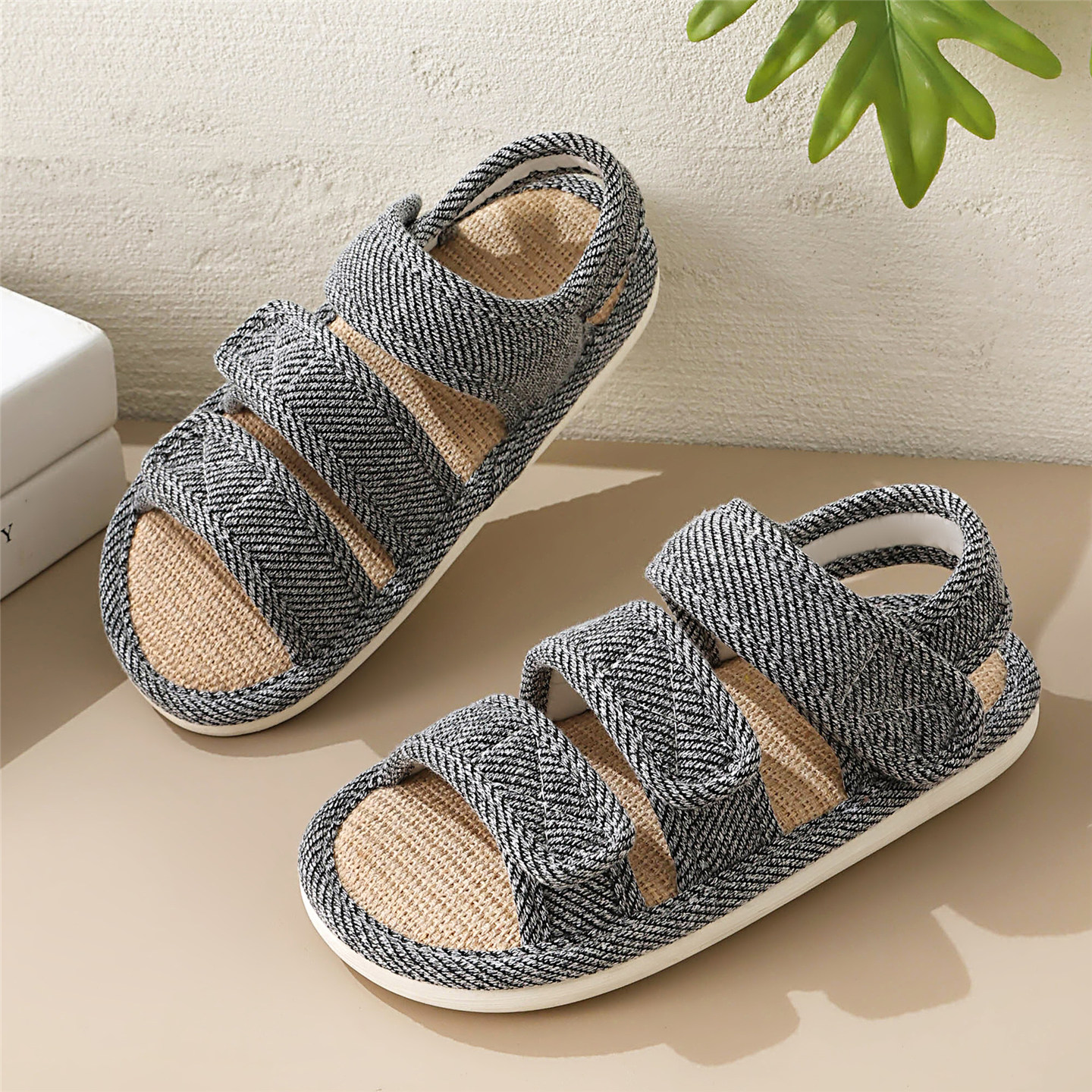 朴西交叉绑带百搭亚麻拖鞋女士透气防脚汗居家室内静音情侣凉拖男