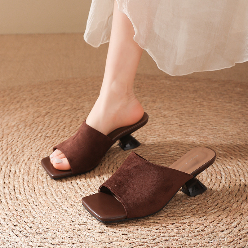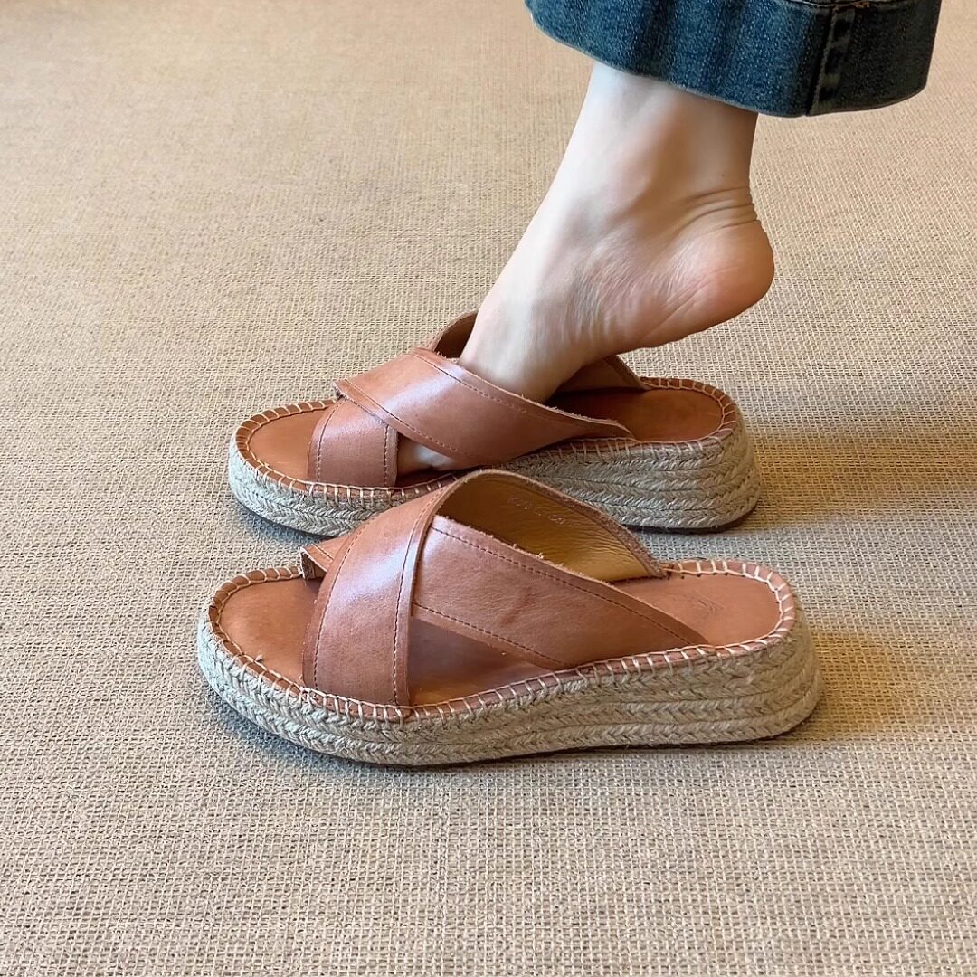 nnmiss/7cm巨稳草编坡跟百搭复古羊反皮圆头一字带露趾拖鞋