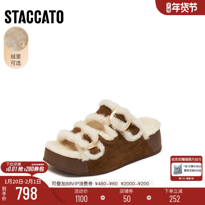 思加图新款复古毛毛鞋保暖一字拖厚底加绒外穿拖鞋EF606DT5
