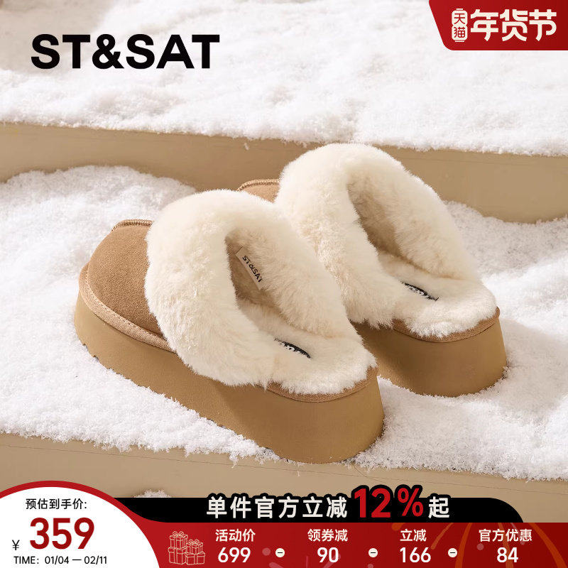 星期六厚底半拖雪地靴女款2025新款冬季加绒加厚保暖毛毛棉拖鞋爆