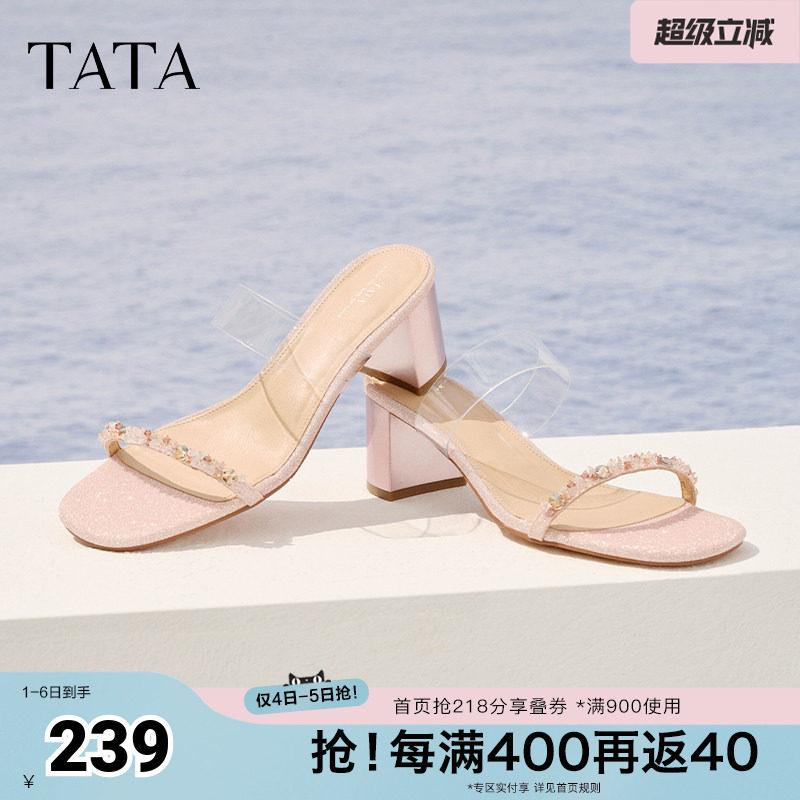 TATA他她法式气质拖鞋女外穿亮片优雅高跟凉鞋春新款7G801BT5奥莱