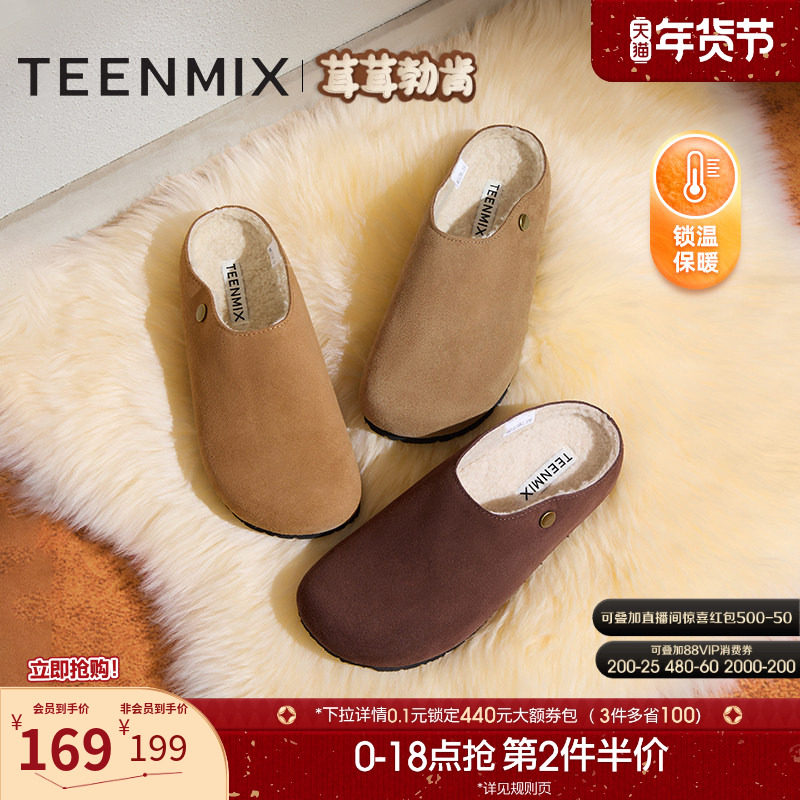 天美意厚底加绒毛毛鞋复古勃肯鞋女包头毛拖鞋冬新款KMZ10DH4