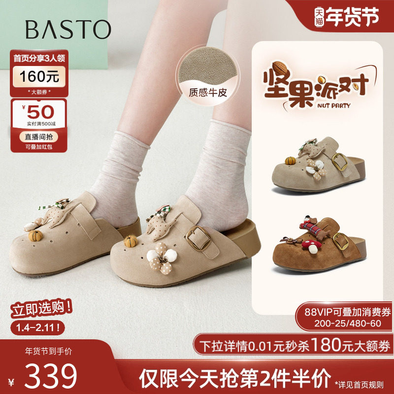 哈森真皮加绒勃肯鞋女鞋2025秋冬季新款舒适休闲鞋一脚蹬拖鞋棉鞋