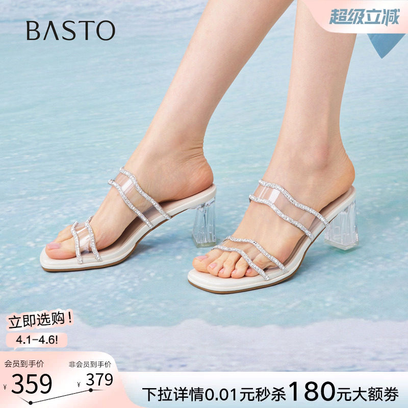 百思图2026夏季商场新款透明水晶跟凉拖鞋外穿粗跟女拖鞋F3053BT6