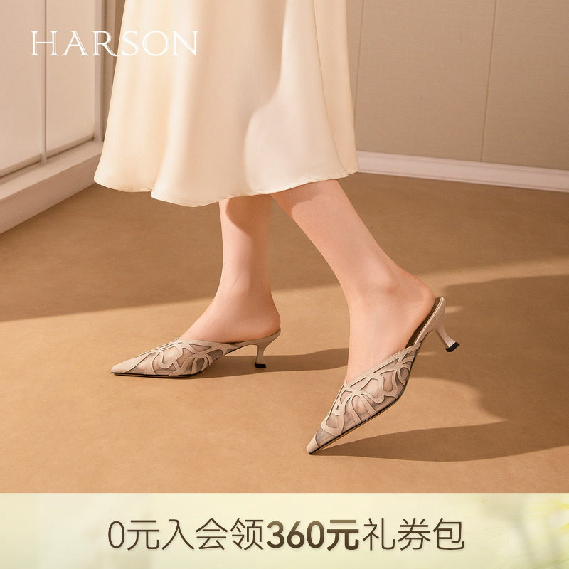 哈森时尚网纱镂空高跟鞋尖头细跟包头时装拖鞋2026新款HWM260110