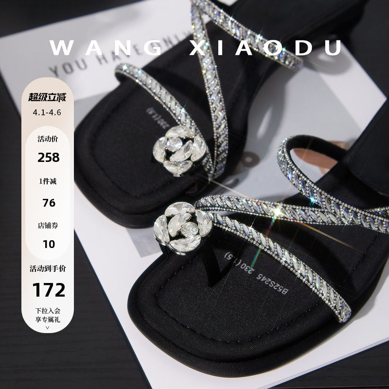 【王小毒】夏日水晶○亮钻夹趾拖鞋女2026年交叉细带方头高跟拖鞋