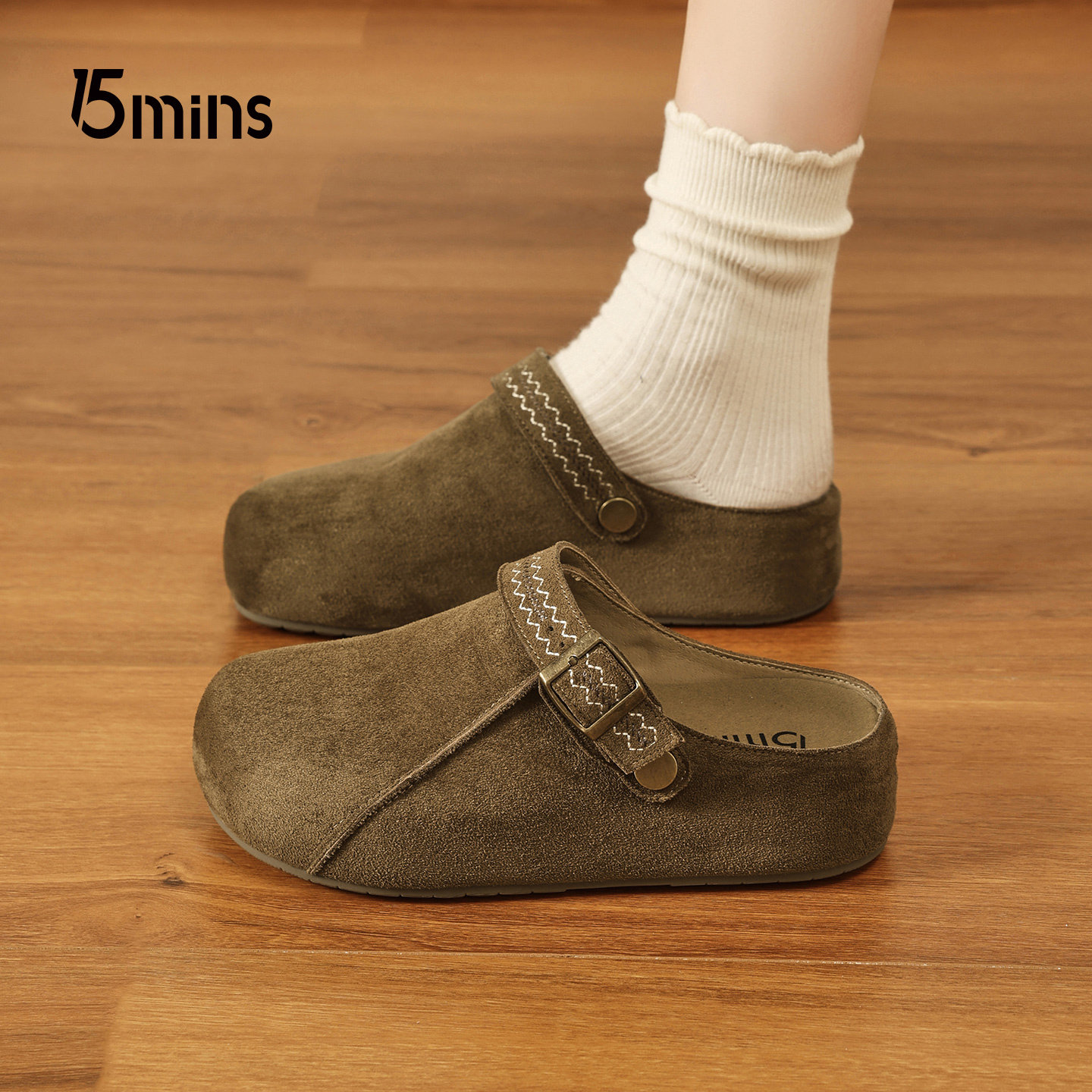15MINS厚底勃肯鞋女半拖2026春季新款一脚蹬懒人增高休闲包头拖鞋