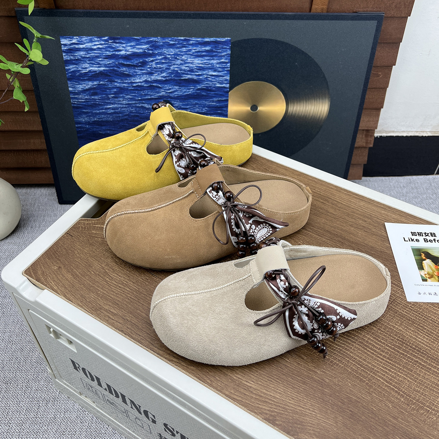 2026春季厚底真皮复古勃肯鞋女时尚丝带串珠软底舒适包头半拖鞋女