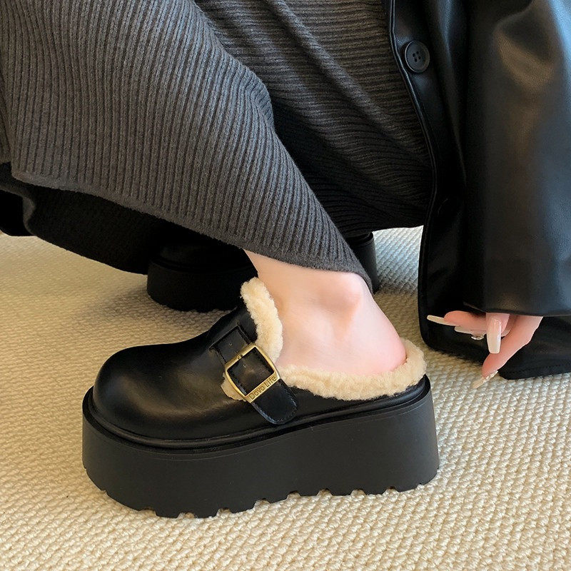 女士冬季居家新款厚底软皮勃肯拖鞋保暖加绒一脚蹬包头半拖鞋