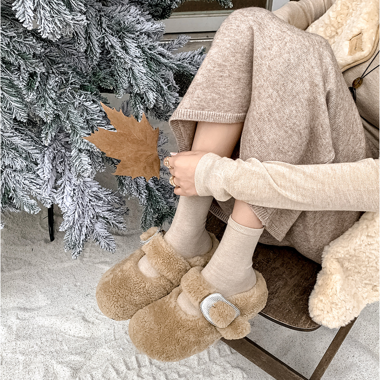 哈森毛毛鞋女款25冬季加绒保暖博肯半拖鞋平底棉鞋一脚蹬豆豆鞋