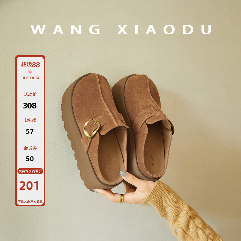 【王小毒】栗秋●6.5cm厚底勃肯拖鞋女秋冬绒面魔术贴半拖包头拖