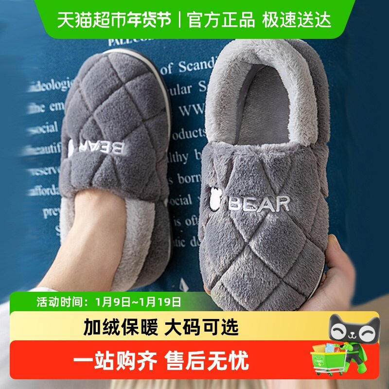 洁丽雅大码男士棉拖鞋冬季2025新款保暖包跟毛绒棉鞋男款冬天外穿