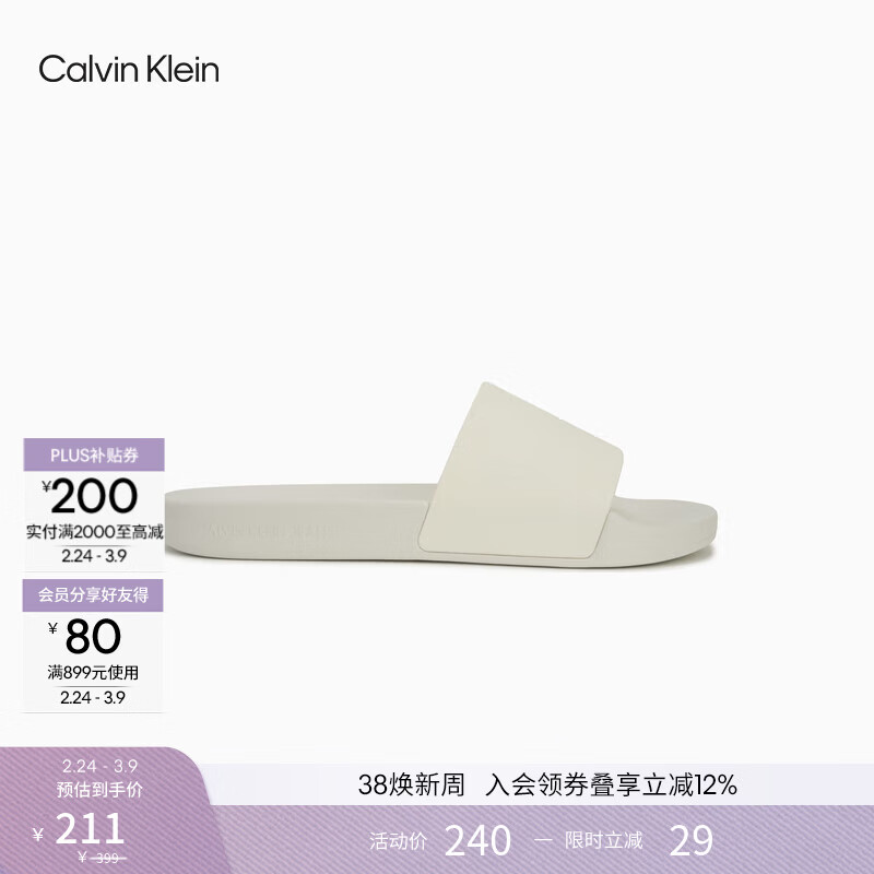 Calvin KleinJeans女士字母压纹ck休闲沙滩海边泳池一字凉拖鞋 0K4-月光白 38